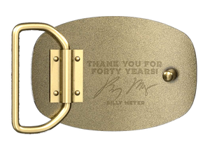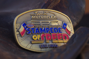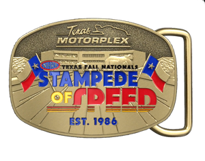 This commemorative belt buckle was produced in limited quantities. It features 3D relief sculpting, antique bronze finish and enamel color fill. The back of the buckle is engraved with a message from Texas Motorplex founder, Billy Meyer.