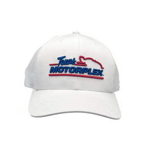 White grey front and bill with White mesh and adjustable snap closure. Features 3D embroidered Texas Motorplex logo.